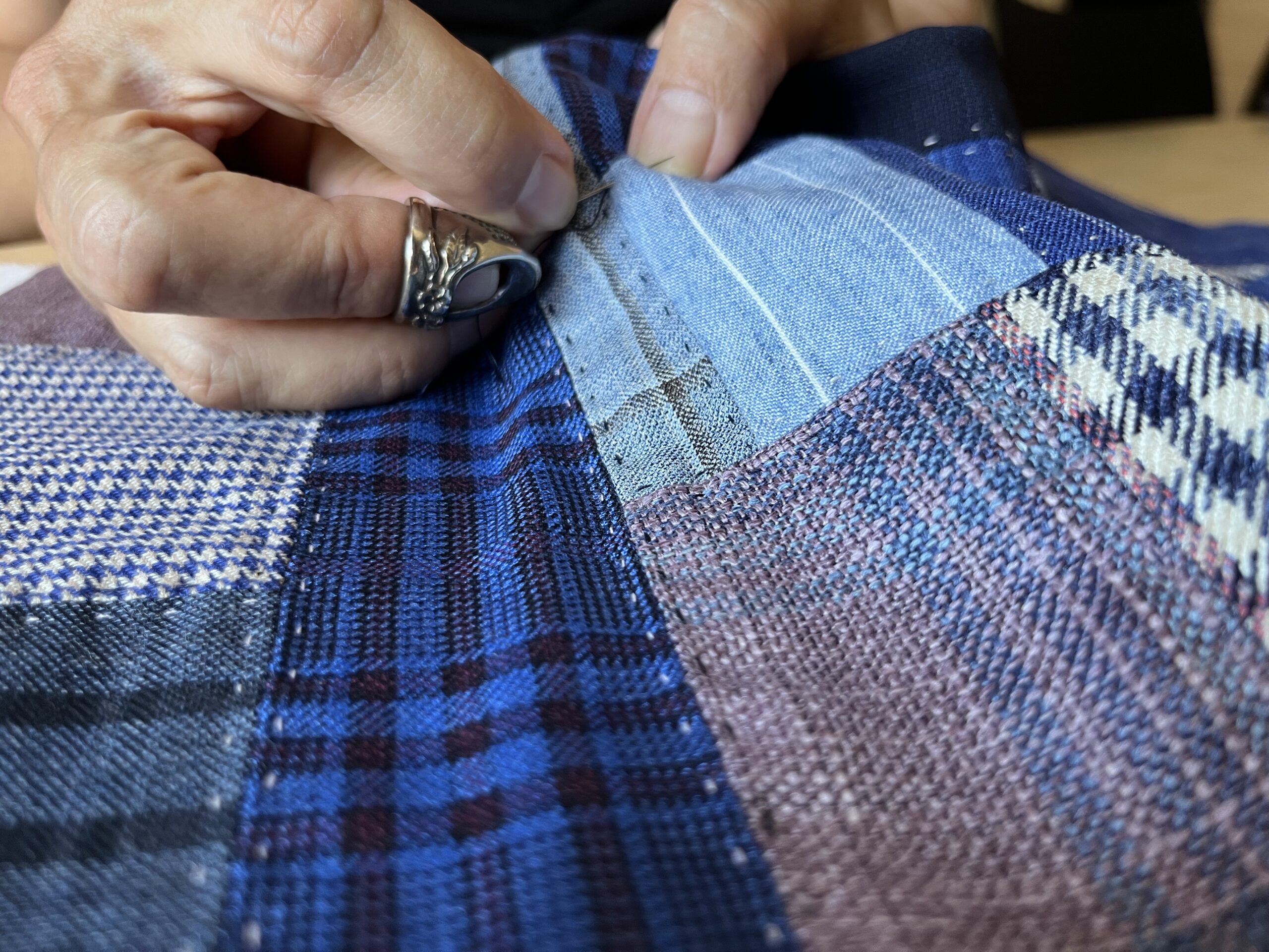 Am Anfang meiner Quilt-Reise haben mich die Arbeiten der japanischen Künstlerin Shizuko Kuroha tief beeindruckt. Sie verwandelt alte Indigo-Stoffe in stille, harmonische Kunstwerke voller Tiefe. Ihre Herangehensweise hat mich inspiriert – und ich habe begonnen, Ähnliches mit europäischen Herrenstoffen auszuprobieren. Diese wirken auf den ersten Blick zurückhaltend, entfalten aber bei genauerem Hinsehen eine faszinierende Vielfalt an Mustern, Texturen und feinen Farbabstufungen.